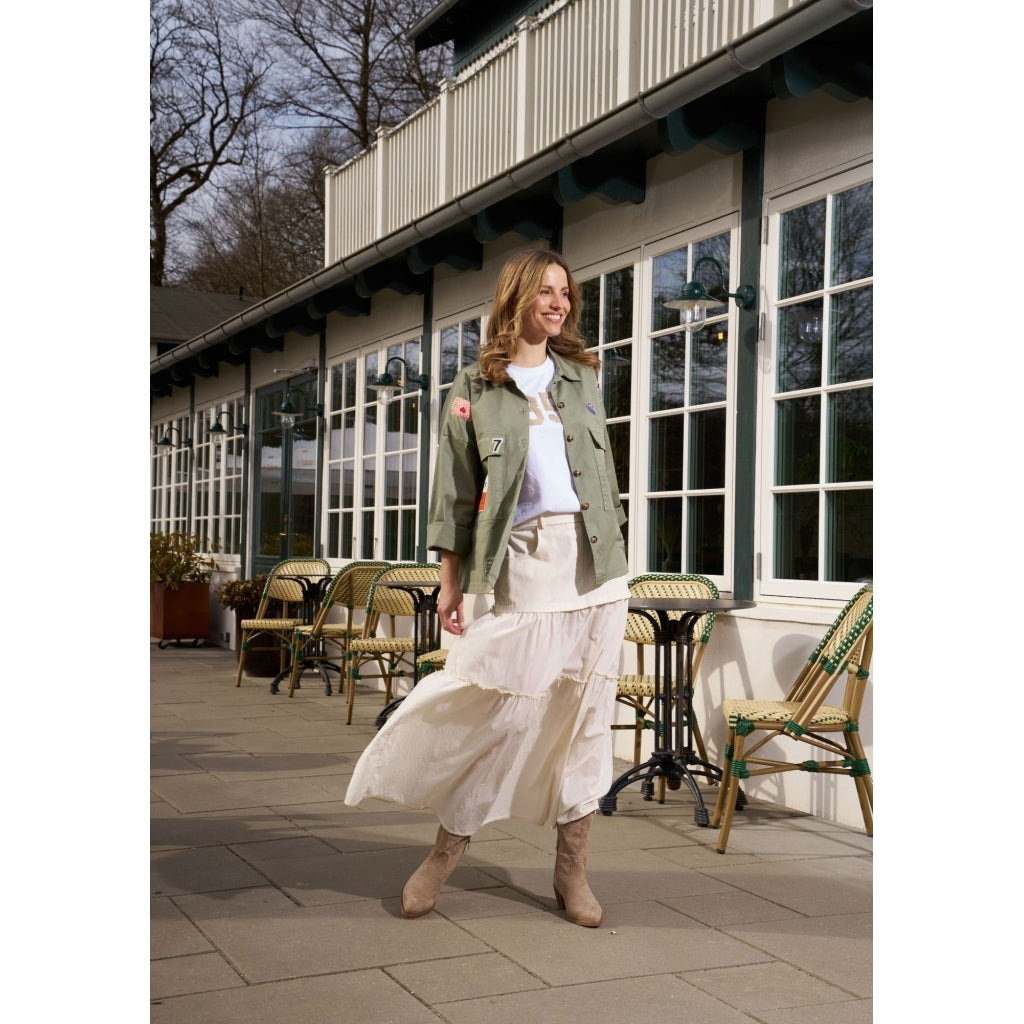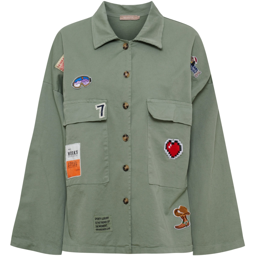 Super cool jakke med små patch rundt på jakken. Jakken har to lommer foran, samt gennemgående knapper. Den kan bruges udover en skjorte eller strik for et mere smart look.