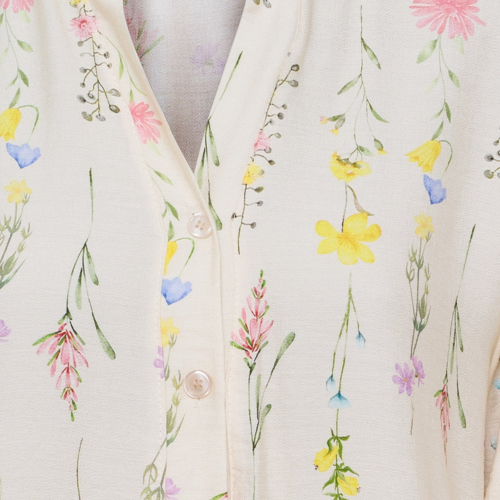 Let kjole fra Marta Du Chateau med fint blomsterprint i bløde farver. Kjolen har V-udskæring, korte ærmer med elastik og en løs, behagelig pasform.