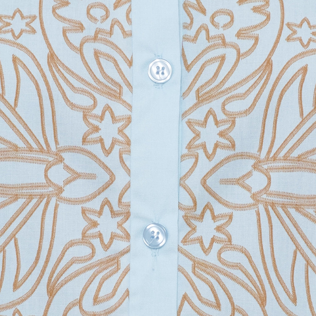 Lyseblå kjole med korte ærmer og feminin flæsekrave. Kjolen har et smukt, dekorativt print i varme nuancer, der giver et elegant udtryk.