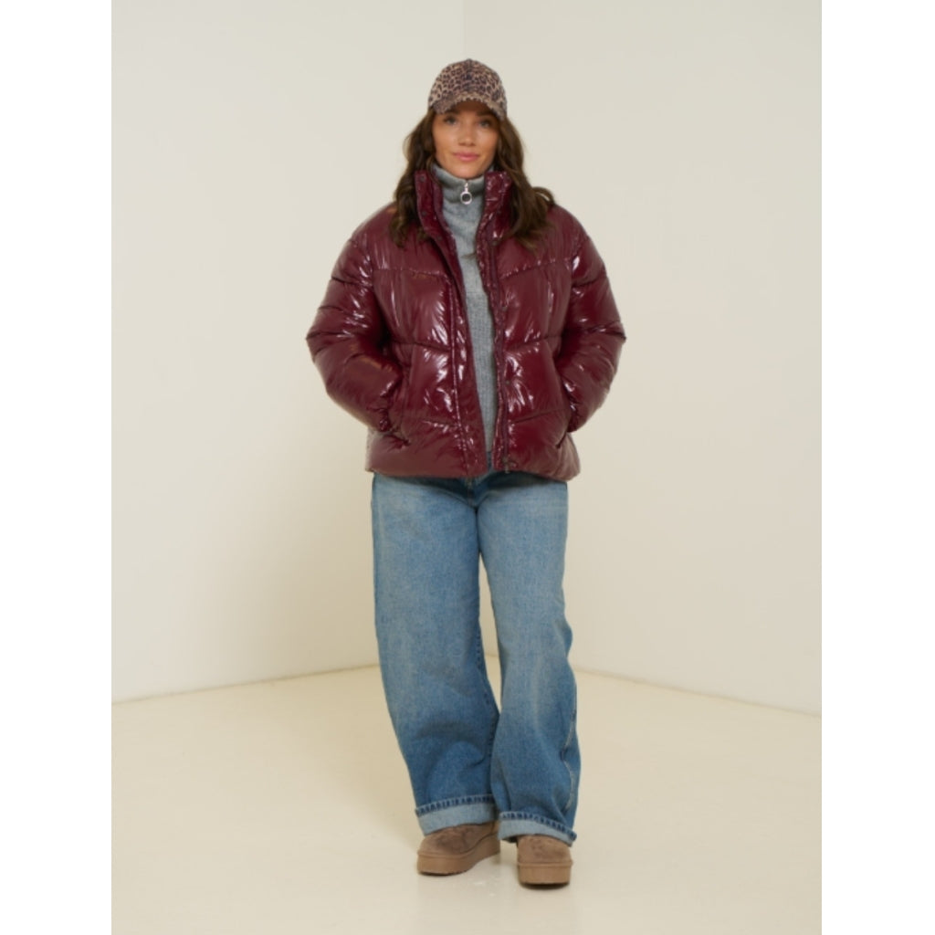 Jakken har høj hals, elastik ved ærme og kan spændes ind i livet.
