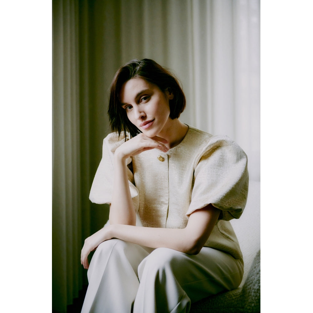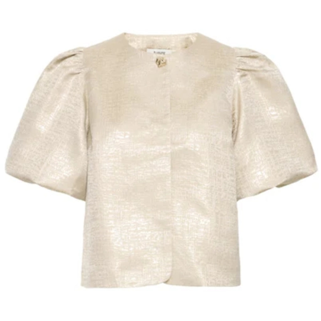 Elegant kortærmet jakke fra B.Young i et flot print. Jakken har pufærmer og knapper front. Den kan styles med et par bukser og en lille hæl for et sofistikeret look.