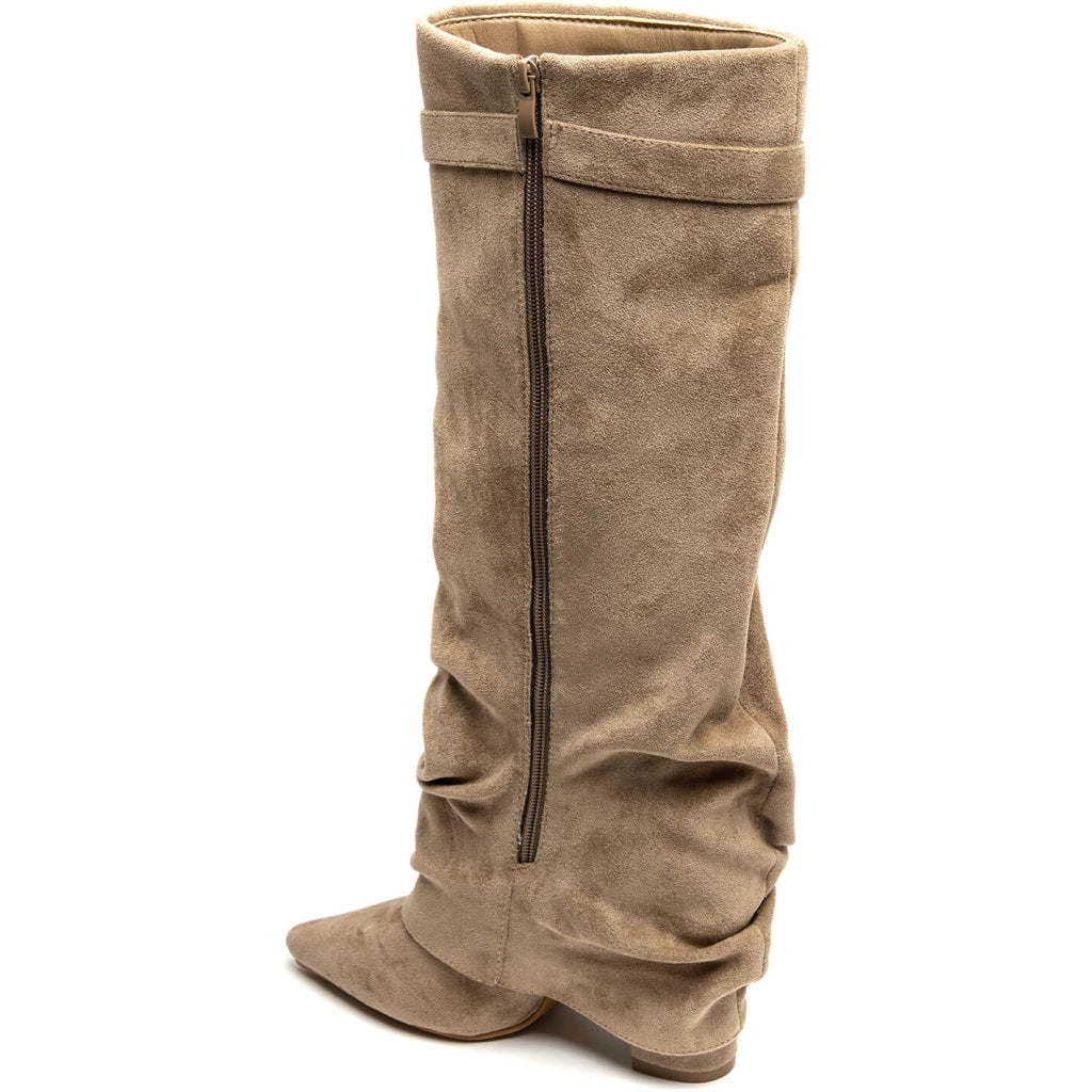 Cool højskaftet støvle med spids snude i imiteret ruskind, perfekt til både hverdag og fest.