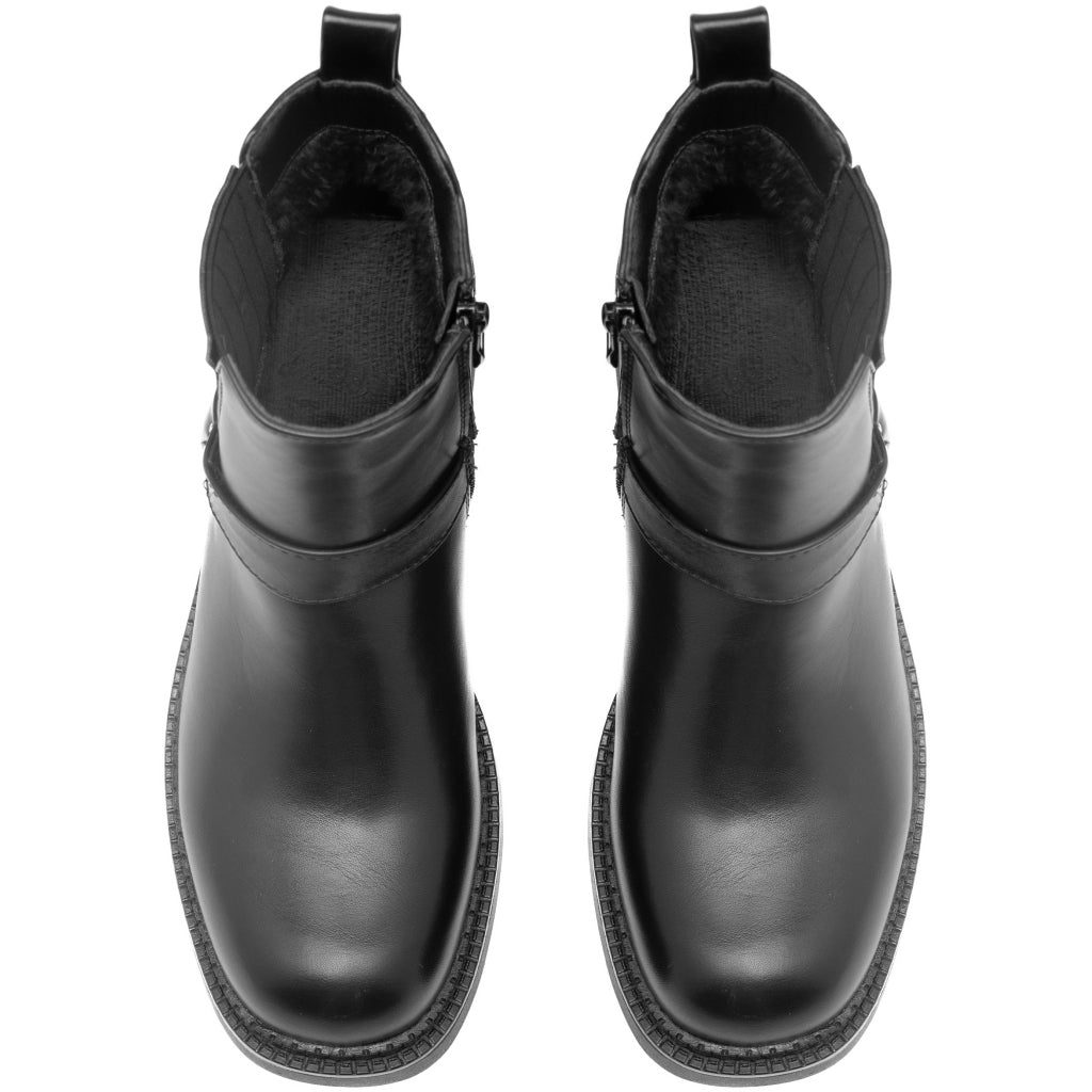Sej, kort bikerstøvle i imiteret skind, med seje spænde-detaljer. Støvlen har foer indeni.