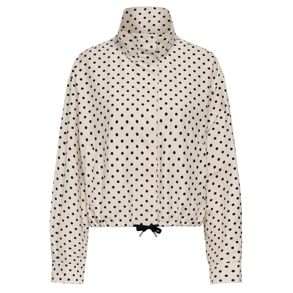 Sejeste jakke fra Only med de fineste dots. Perfekt til at give dit outfit et pift. Jakken kan snøres ind i taljen, og har en høj halset krave.