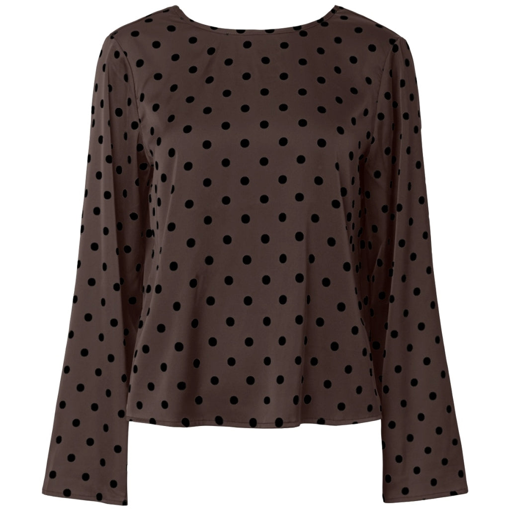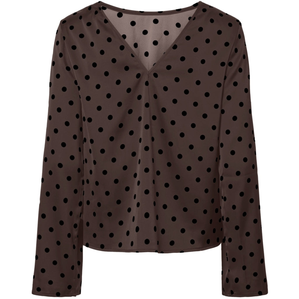 Elegant satin bluse fra Pieces i polkaprikket mønster. Blusen har en løs pasform og V-udskæring på ryggen. Den kan styles med den matchende nederdel eller buks - men kan også styles med et par jeans for mere afslappet look.