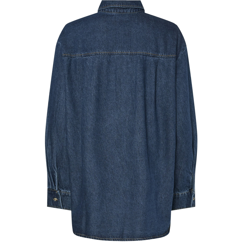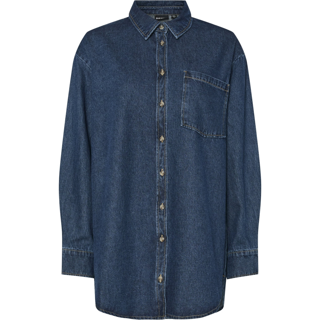 Sej denimskjorte fra Pieces med lomme på det ene bryst og små slidser i siden nederst. Perfekt til hverdagsbrug.