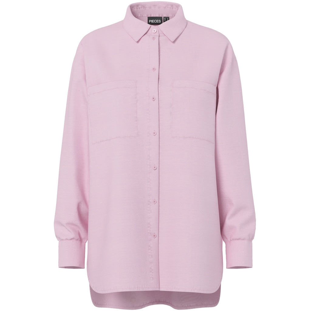 Sej stribet skjorte fra Pieces med brystlommer og knapper langs fronten. Skjorten er loosefit i pasformen, og er længere bagtil end foran.