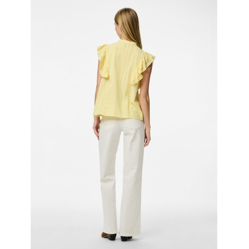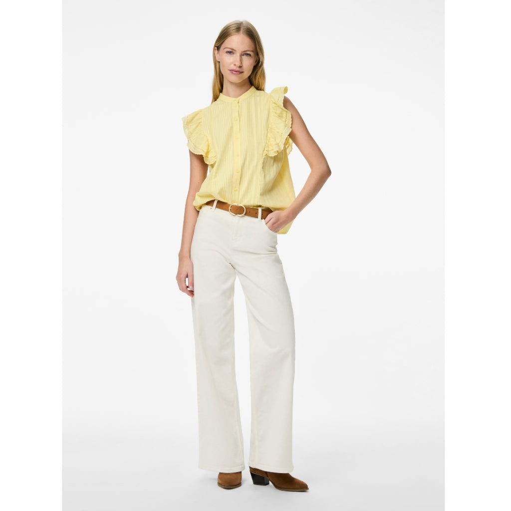 Fin og feminin top med smukke flæsedetaljer fra Pieces. Toppen har sofistikerede knapper og går en smule op i halsen. Ideel her til foråret og sommeren med en fin nederdel eller shorts til.