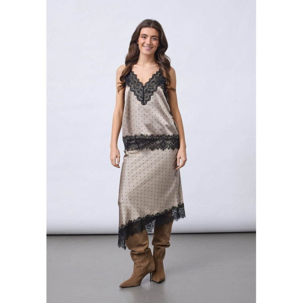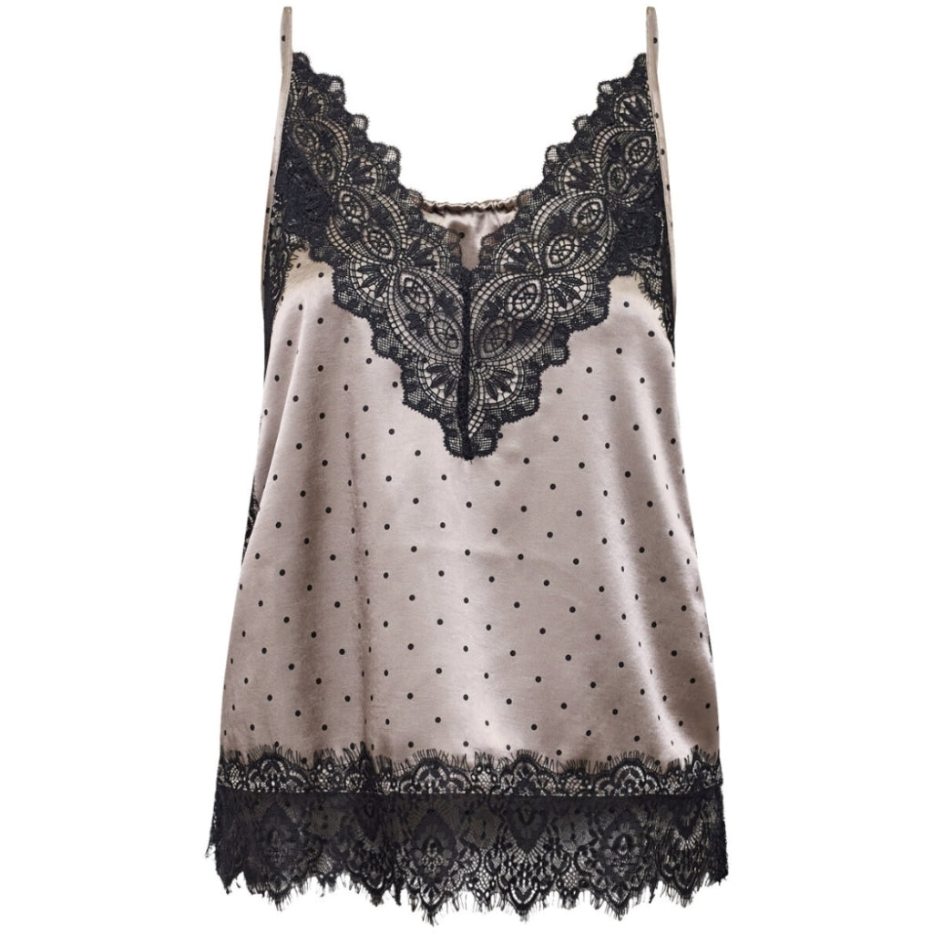 VALERIE-ST er en elegant top i luksuriøs silkeblød satin med et feminint polka dot mønster. Toppen har en V-udskæring prydet med detaljerige blondekanter. Den har justerbare stropper. Der findes også en matchede nederdel til.