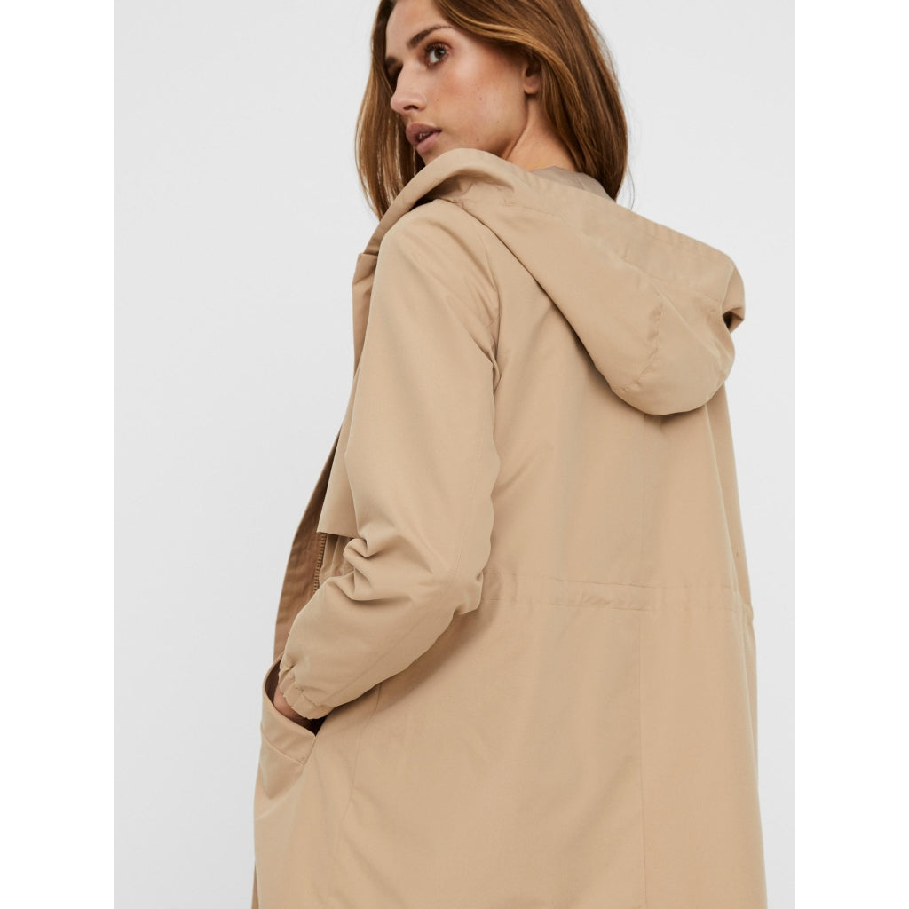 Den har bindebånd i taljen, lommer ved brystet og elastik ved håndleddene.