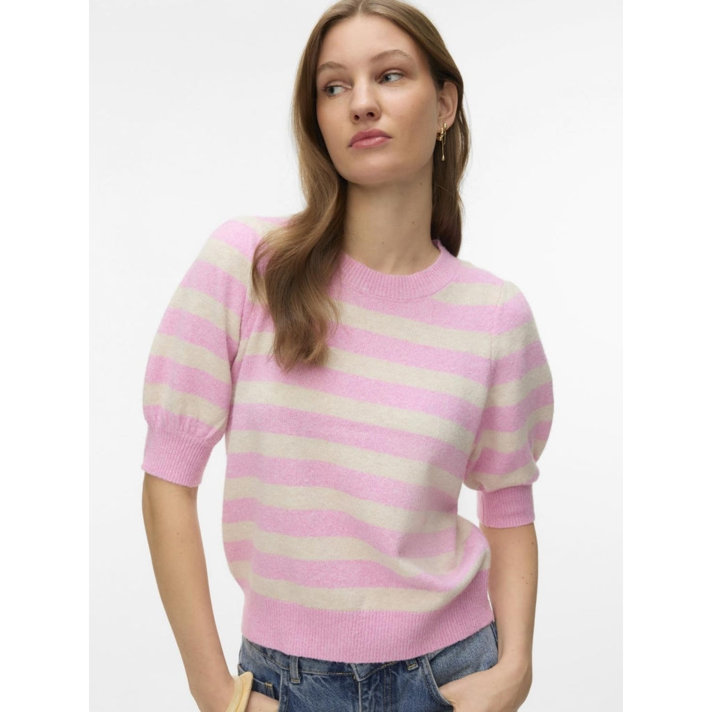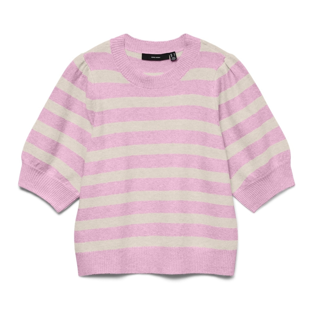 En striktrøje med rund hals og 2/4 ærmer i puffstil, der giver en afslappet og behagelig pasform. Perfekt til afslappede outfits året rundt.
